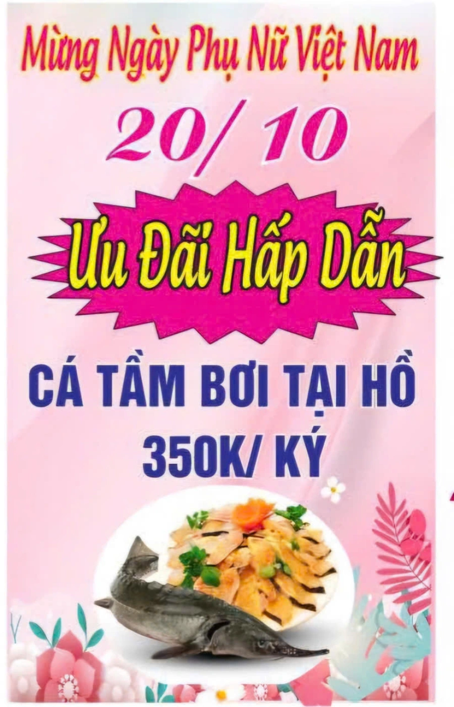 - Ưu đãi Cá Tầm Sống: Cá tầm sống bơi tại hồ chỉ 350.000đ/kg (đã bao gồm chế biến). Quý khách có thể chọn trực tiếp cá sống tại hồ để đảm bảo độ tươi ngon tuyệt đối.